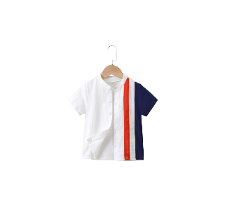 The red–navy stripe detail adds a dynamic focal point, giving the shirt a sporty, modern look that enhances a boy’s youthful energy.