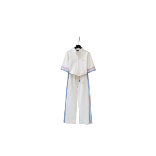 - Wide-leg full-length pants with elastic waistband and drawstring, featuring pastel side stripes for an elongated silhouette.