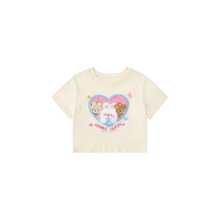 Style: Short-sleeve crop tee featuring a cute heart-shape graphic with playful character illustrations.