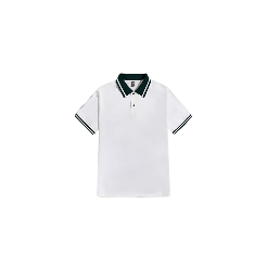 Color: White base with dark-green contrast collar and sleeve cuffs.