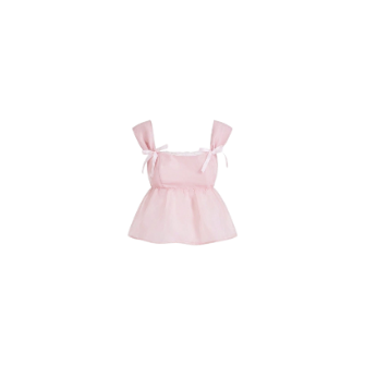 Design: Sleeveless baby-doll top with wide shoulder straps tied into delicate bows; gathered waist for a flared, feminine silhouette.