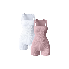 Design: One-piece seamless jumpsuit with sculpting 3D contour texture, square neckline, wide straps, and mid-thigh length.